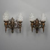 Paar bronzen tweelichts wandlampen in de vorm van toortsen -bij één kapje ontbreken twee bevestigingsschroefjes-, 47 × 39 × 27 cm