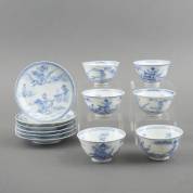 Zes Japans porseleinen kommetjes en schoteltjes met blauw-wit jachtdecor, 19e eeuw -enkele defecten-, Ø 13 cm
