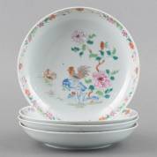 Vier Chinees porseleinen borden met famille rose hanendecor, Qianlong, 18e eeuw -één bord met twee haarlijnen en randschilders, twee met randschilfers-, Ø 22,5 cm