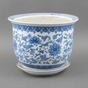 Grote Oosterse porseleinen cache-pot met blauw-wit bloemdecor -gelijmde randchip-, op onderschotel, 20e eeuw, 33,5 × Ø 42,5 cm