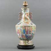 Chinees porseleinen famille rose vaas, vermaakt tot lampvoet, met decor van figuren, kostbaarheden en vlinders, de hals met twee oren en chilongs in reliëf, Kanton, 19e eeuw, hoogte 47 cm