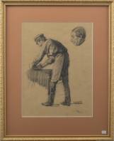 Willem Bastiaan Tholen (1860-1931), studie van man met blokschaaf en profiel, houtskool op papier, r.o. gesigneerd, 38 × 28 cm