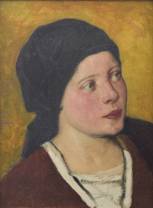 Johan Antoni de Jonge (1864-1927), portret van jonge vrouw met hoofddoek, olieverf op doek, niet gesigneerd, inclusief echtheidsverklaring met atelierstempel door W.A. de Jonge, 1988, 34 × 25 cm
