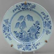 Chinees porseleinen schotel met blauw-wit tuindecor met treurwilg en pioenrozen, Qianlong -chip met gerelateerde haarlijn-, voorzien van metalen ophanging met vergulde vogelpootjes, Ø 38,5 cm