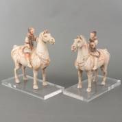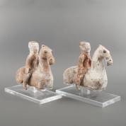 Paar polychroom beschilderde Chinese terracotta grafbeelden: ruiters te paard, Han-stijl en vermoedelijk periode -enkele delen gelijmd-, 30 × 30 × 9 cm, daarbij: losse plexiglazen basementen