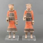 Paar polychroom beschilderde Chinese terracotta grafbeelden: wachters met bronzen speertjes, Han-stijl en vermoedelijk periode, 44,5 × 15 × 10 cm, op plexiglazen basementen, 17,5 × 15 cm