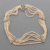 Vijfstrengs parelchoker, de 14kt rgouden sluiting en tussenstukken gezet met in totaal 35 roosdiamantjes, lengte 34 cm