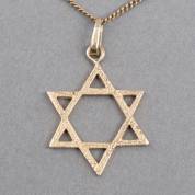 14kt gouden collier met gourmetschakel en roségouden musketonsluiting, waaraan 14kt gouden Davidster hanger, gewicht 12,6 gram, collier 48 cm