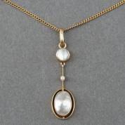 14kt gouden gourmet schakelcollier waaraan negligéehanger gezet met parelmoer en mabéparel, brutogewicht 4,0 gram, 45 cm en 4 cm