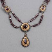 Dubbelstrengs granaten collier met zilveren sluiting waaraan drie zilveren- en 14kt gouden tussenschakels en druppelvormige hanger gezet met gefacetteerde granaat, brutogewicht 52 gram, circa 40 cm