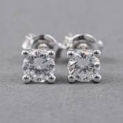 Paar 14kt witgouden solitairoorstekers, elk gezet met briljantgeslepen diamant, totaal circa 0.91ct, brutogewicht 1,6 gram, Ø 5,3 mm inclusief HRD Antwerp diamantrapporten