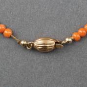 Bloedkoralen collier van kleine kralen met geribd 14kt gouden slot, brutogewicht 15,6 gram, lengte 87 cm