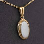 14kt gouden gourmet schakelcollier waaraan 14kt gouden hanger gezet met ovaal cabochongeslepen opaal, jaren '60, brutogewicht 4,8 gram, lengte circa 40 cm, hanger 2,5 cm -collier met knoopjes-
