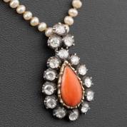 Parelcollier van zoetwaterpareltjes aan14kt gouden slot waaraan druppelvormige zilveren en gouden hanger gezet met bloedkoraal omgeven door vijftien roosgeslepen diamanten, brutogewicht 14,8 gram, collier 48 cm, hanger 3,5 cm