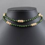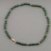 Collier van 59 donkergroene jade bolkralen met gouden tussenkralen, aan 14kt gouden bolslot, 26 cm