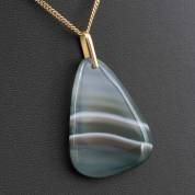 14kt gouden plat schakelcollier, waaraan een aangeslepen streepagaten hanger aan 14kt gouden draagoog, gewicht collier 4,6 gram, collier 50 cm, hanger 5 cm