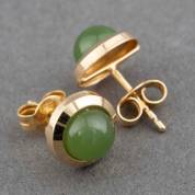 Paar 14kt gouden oorstekers gezet met cabochongeslepen groene steen, brutogewicht 1,8 gram, circa Ø 1 cm