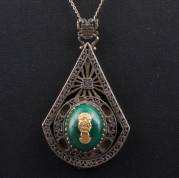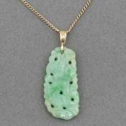 14kt gouden gourmet schakelcollier waaraan een gesneden jade hanger aan 14kt gouden hangoog, gewicht goud 2,7 gram, lengte 45 cm, hanger 4 cm