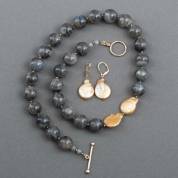 Labradoriet collier van bolkralen en twee goudgekleurde muntparels, aan verguld 1e gehalte zilveren kapittelslot en paar verguld 1e gehalte zilveren oorhangers waaraan goudgekleurde muntparel, oorhanger 4 cm, collier 52 cm