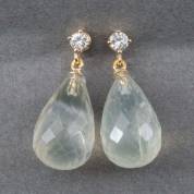 Paar 14kt gouden oorhangers gezet met briljantgeslepen diamant, totaal circa 0.20ct, en briolette van prasioliet, brutogewicht 5,4 gram