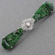 Platina strikbroche gezet met gesneden jade en centraal een briljantgeslepen diamant 0,10ct, omgeven door 22 roosgeslepen diamanten, art deco, brutogewicht 5,6 gram, 5,5 cm