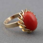 14kt gouden ring gezet met ovaal cabochongeslepen rode bloedkoraal, mt. 18,25, brutogewicht 4,8 gram