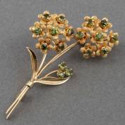18kt gouden broche gevormd als twee bloemen gezet met zeventien briljantgeslepen toermalijnen, brutogewicht 9 gram, 5,5 × 3,5 cm