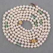 Twee parelcolliers, elk met zes smaragdkraaltjes aan 14kt gouden bolslot, ook aan elkaar te dragen als lang collier, 47 cm of 94 cm