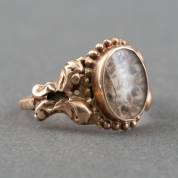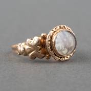 14kt gouden ring met haarwerkje van bloem en monogram achter glas, 19e eeuw, mt. 19, brutogewicht 2,4 gram