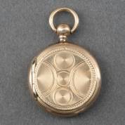 14kt gouden portrethanger met geguillocheerd decor, met ruimte voor één portret en relikwie, brutogewicht 3,8 gram, Ø 2 cm -gebruikssporen-