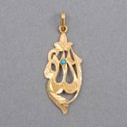 21kt gouden hanger met Arabische tekst voor 'God', gezet met kleine turkoois, brutogewicht 3,8 gram, 5 × 1,8 cm