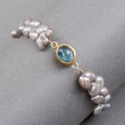Armband van gecultiveerde grijze barok parels met 18kt gouden slot gezet met maansteen, brutogewicht 19,2 gram, 19 cm