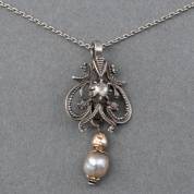2e gehalte zilveren ankerschakelcollier waaraan een zilveren hanger gezet met drie roosgeslepen diamanten en aan een haak een gouden pampel met een vermoedelijk natuurlijke parel, Ø 6 mm, brutogewicht 5,4 gram, collier 40 cm, hanger 4 cm -gebruikssporen-