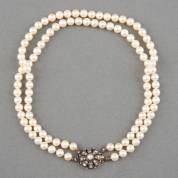 Tweestrengs collier van gecultiveerde parels, aan 14kt gouden slot met in zilver gezet een rozet van roosgeslepen diamanten, middensteen circa 5 mm, slotaanzet eveneens gedecoreerd met roosgeslepen diamantje, 37 cm