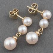 Paar 14kt gouden oorhangers met drie gecultiveerde parels, brutogewicht 2,7 gram, 2,5 cm