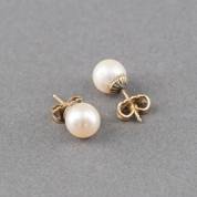Paar 14kt gouden oorstekers gezet met gecultiveerde parel, Ø 7 mm, brutogewicht 2,2 gram