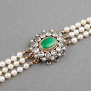 Driestrengs parelcollier van kleine gecultiveerde parels, aan 14kt gouden en zilveren bakslot gezet met cabochongeslepen jade, omgeven door roosgeslepen diamanten en zaadpareltjes, brutogewicht 46 gram, 47 cm -bolletjes slotaanzet onedel-