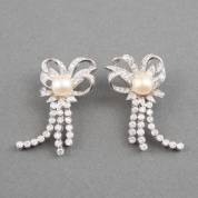 18kt witgouden en platina oorclips in strikvorm, elk gezet met parel en een pavé van achtkantgeslepen diamanten, waaraan een baartje volledig gezet met 21 briljantgeslepen diamanten, brutogewicht 29,0 gram, 5,5 cm -twee diamanten missen, één aanwezig-