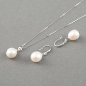 Druppelvormige zoetwaterparel aan 1e gehalte zilveren schuifketting, en paar 1e gehalte zilveren oorhangers met zoetwaterparel, 44 cm