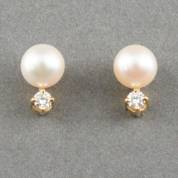 Paar 14kt gouden oorstekers elk gezet met gecultiveerde parel en briljantgeslepen diamant, brutogewicht 2,8 gram, circa 1 cm
