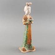 Chinees terracotta beeld met sancai glazuur in de vorm van een dame met pot, Tang-stijl en vermoedelijk periode -chips, knot en hoofd gelijmd-, 35 × 10 × 10 cm