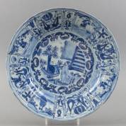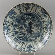 Chinees porseleinen schotel met blauw-wit decor: centraal twee figuren in tuin, de rand met afwisselend een figuur en bloemdecor in vakverdeling, Transition -twee barsten in rand, waarvan één met gerelateerde chip; bakfoutje in rand-, Ø 36 cm