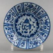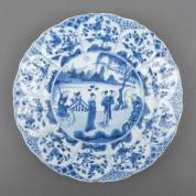 Chinees porseleinen dubbelbord met blauw-wit decor van een scène uit de Romance of the Western Chamber, gemerkt, Kangxi, Ø 27,5 cm