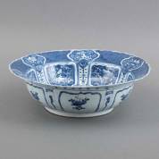 Chinees porseleinen kom met blauw-wit decor: centraal een scroll en een kalebasvaas, gedeeltelijk omringd door een 'thunder pattern', in de cartouches kostbaarheden en bloemen, aan weerszijden een drakenkop, Wanli -beschadiging in rand gelijmd, aangrenzende haarlijn, gaatje in standring-, 6 × Ø 21 cm