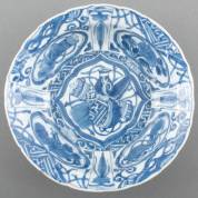 Chinees porseleinen 'Swatow' schotel met blauw-wit vogeldecor, Wanli -randchip-, 7,5 × Ø 36,5 cm