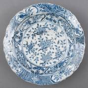 Chinees porseleinen bordje met blauw-wit bloemdecor, de rand met vakverdeling, gemerkt met blad, Transition -randchipje-, Ø 16,5 cm