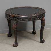 Gezwart houten ronde tafel met gesneden druivendecor -lakwerk met slijtage-, 50 × Ø 65 cm