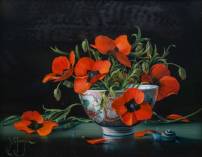 Ytje de Jong (1948), 'Summery Sweetness II - 18e-eeuws Amsterdams bont schaaltje met klaproosjes', olieverf op paneel, l.o. gesigneerd en verso gedateerd 2009, 24 × 30 cm -volgrecht van toepassing-