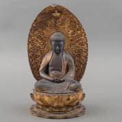 Japanse verguld houten en lakwerk Boeddha Amitabha op lotustroon, 19e eeuw -restauraties aan mandorla-, 37 cm hoog