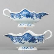 Paar Chinees porseleinen saucières met blauw-wit floraal decor, Qianlong -randschilfer-, 8,5 × 21,5 × 10,5 cm